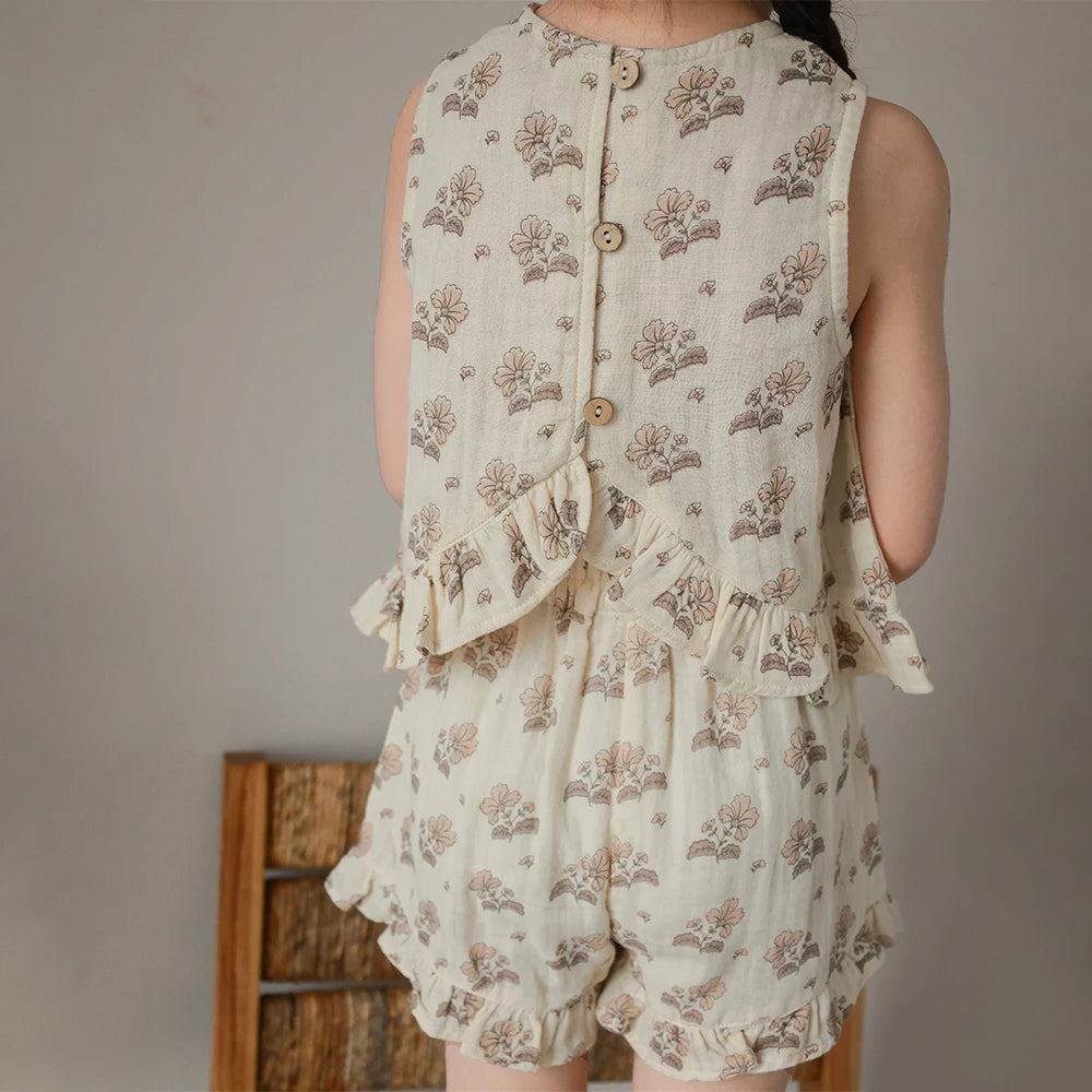 Design: Features a cute floral pattern and a square collar for a charming look. The set includes a sleeveless top and matching bottoms, perfect for summer.